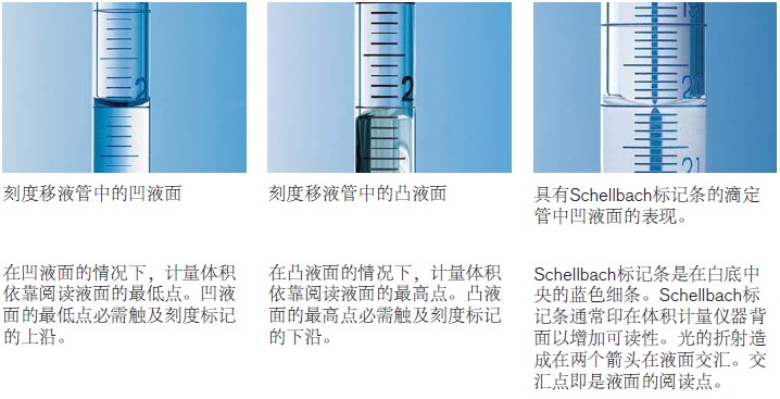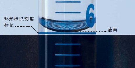 为了液面的无视差调节,体积计量仪器需要放置水平,观察者的眼睛必需与液面在同一高度。在这个位置,环形刻度标记应为一条线。
