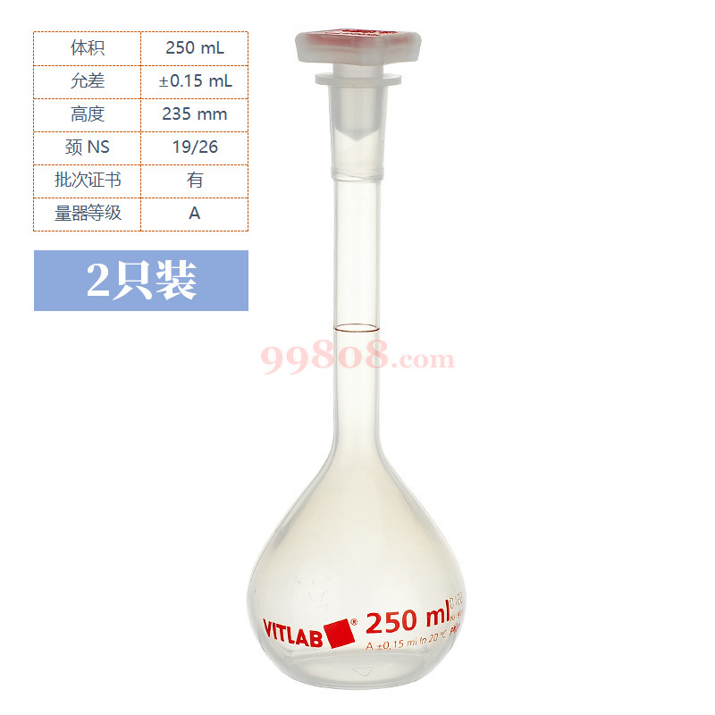 VITLAB | 塑料容量瓶A级(PMP)含批次证书 | 250mL±0.15ml 带PP材质NS塞子