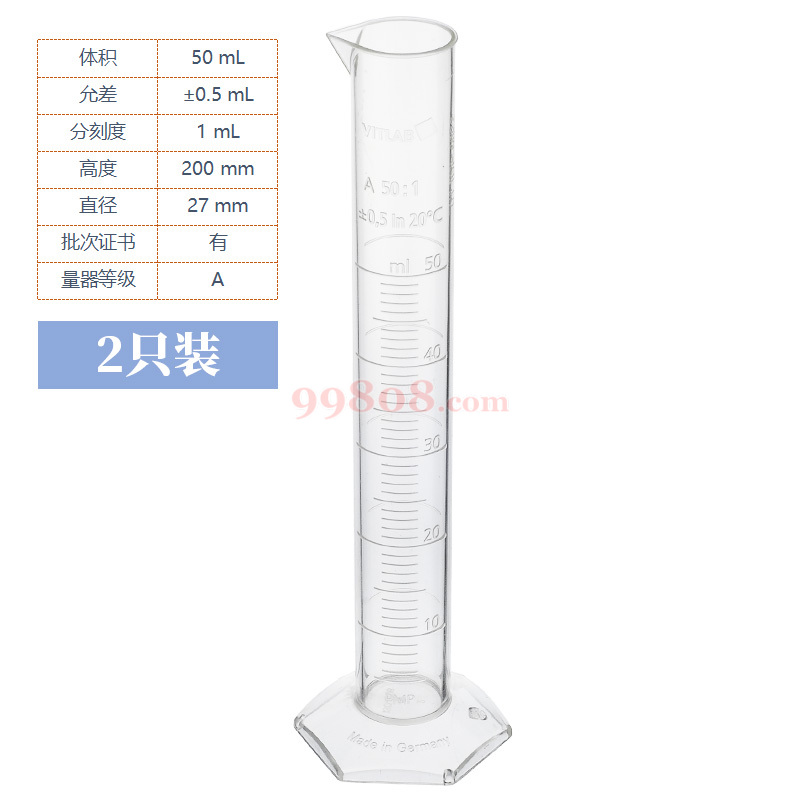 VITLAB | 塑料刻度量筒A级(PMP)KB证书 | 50mL ±0.5mL