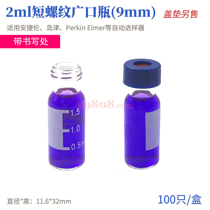 适用于下列品牌仪器: Agilent、Waters、Thermo Scientific、Beckman、CTC、Gilson、Knauer、Shimadzu、Spark、Varian、VWR (Merck)/Hitachi、PerkinElmer等。 9mm短螺纹广口样品瓶 *国际通用能普遍兼容于市场面上所有常规自动进样器 *带书写的样品瓶提供带刻度的书写标签方便识别样品 *采用短螺纹高领脖的方式使其更容易被自动进样器抓取 *普遍采用高品质进口5.0硼硅盐酸玻管制造除此...