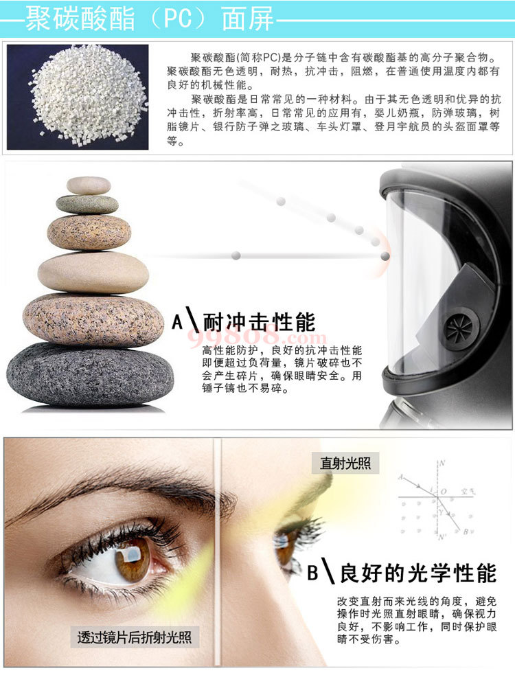 面具的大眼窗片由聚碳酸酯制成,具有开阔的视野,良好的光学,耐冲击性能。
