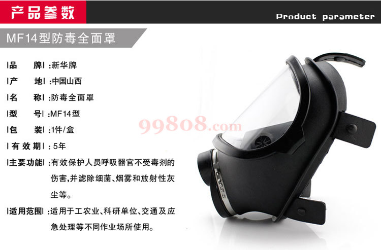 MF14型防毒面具是一种过滤式单眼窗个人呼吸道防护器材,能有效地保护佩戴人员的面部,眼睛和呼吸道免受毒剂、生物战剂和放射性尘埃的伤害。可供工业、农业、医疗队和科研等不同领域人员使用。亦可供军队、警察和民防使用。