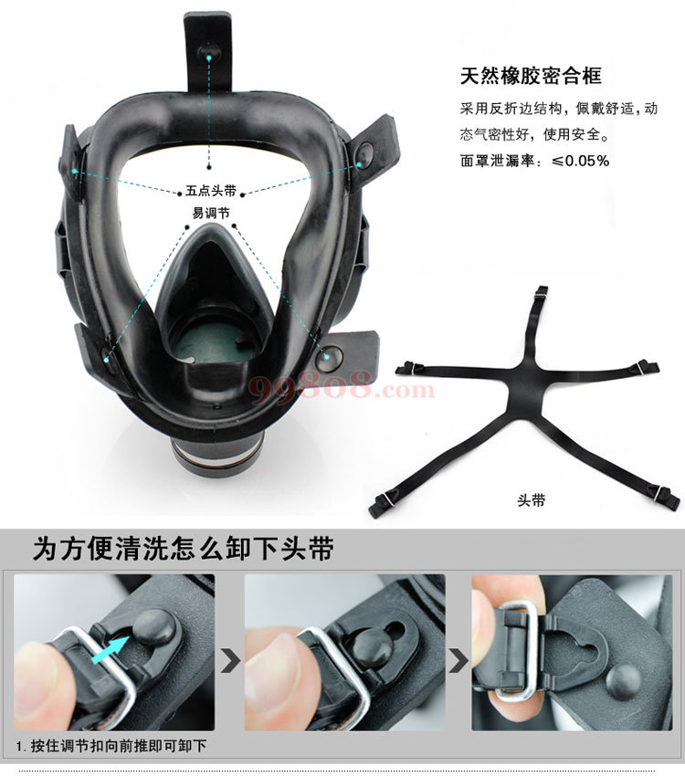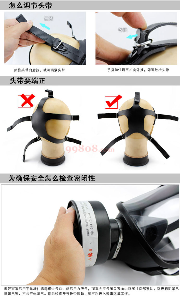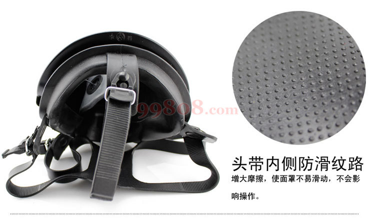3.1佩戴面具时,由下巴处向上佩戴,再适当调整头带,戴好面具后用手掌堵住滤毒罐进气口用力吸气,面罩与面部紧贴不产生漏气,则表明面具已佩戴气密,可以进入染毒区域工作。