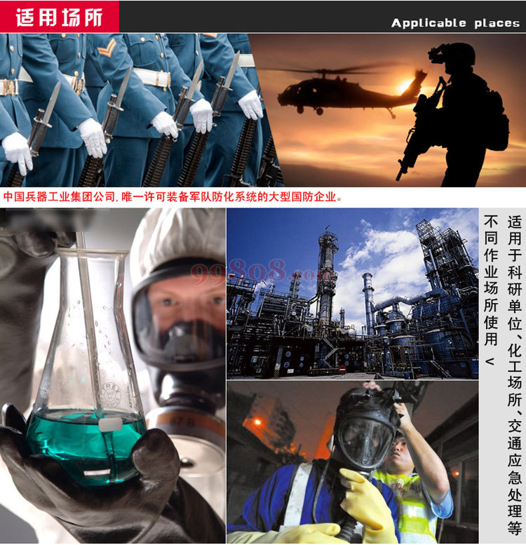 主要适用于以下场合 1、 光学、防导弹液体推进剂、高能燃料燃烧时产生的废气。 2、 氧化剂和燃烧剂的操作人员在加注、转注等操作场合穿用。 3、 一氧化碳、光气、沙林、芥子气等。 4、 特定场合下的防酸、防碱。 5、 粮库、化工厂、城建(下水道)等的维修。 6、 气密、防尘、防水、防潮、防沙。 7、 还广泛的应用于野营训练,井下油田、渔民打捞等。