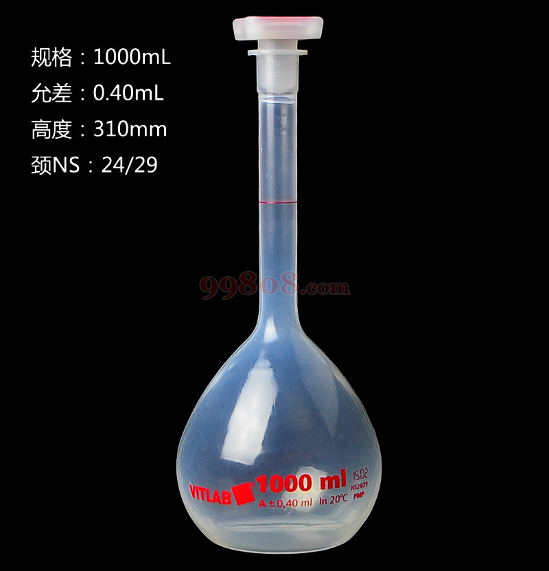 VITLAB | 塑料容量瓶A级(PMP)含批次证书 | 1000ml ±0.4ml 带PP材质NS塞子