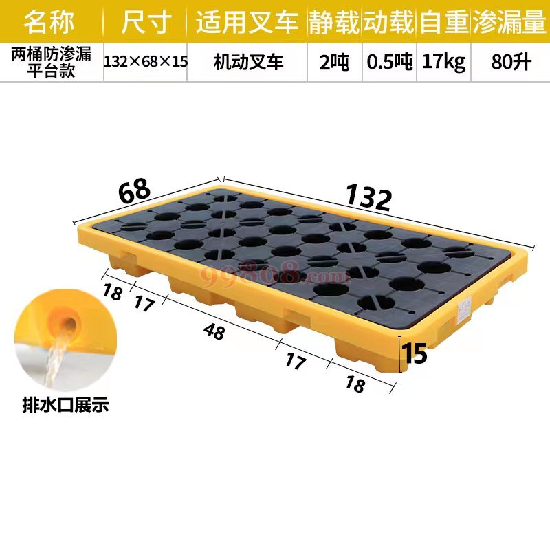1.采用加厚侧边框及中心承重结构,非常坚固,可稳固地承载满载的油桶、化学品桶等各种存储容器及机器设备