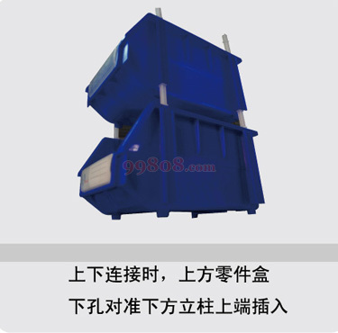 每个零件盒附四根塑料支柱,用以撑高重迭使用,增加取物空间。