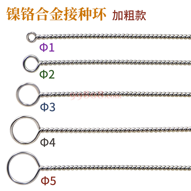 镍铬合金接种环是在德国铂金的基础上,采用替代材料开发的,其特点有: 其一,耐高温的性能不比铂金的低,在高温情况下,镍铬合金接种环的使用弹性(刚性)相反的比铂金接种环强,寿命反而高。使用期长。 其二,与普通的金属接种环比特性不言自明。 其三,与塑料接种环的方便相比,同样,可以成批在高压灭菌锅高温消毒后使用,达到不用每次消毒的目的。