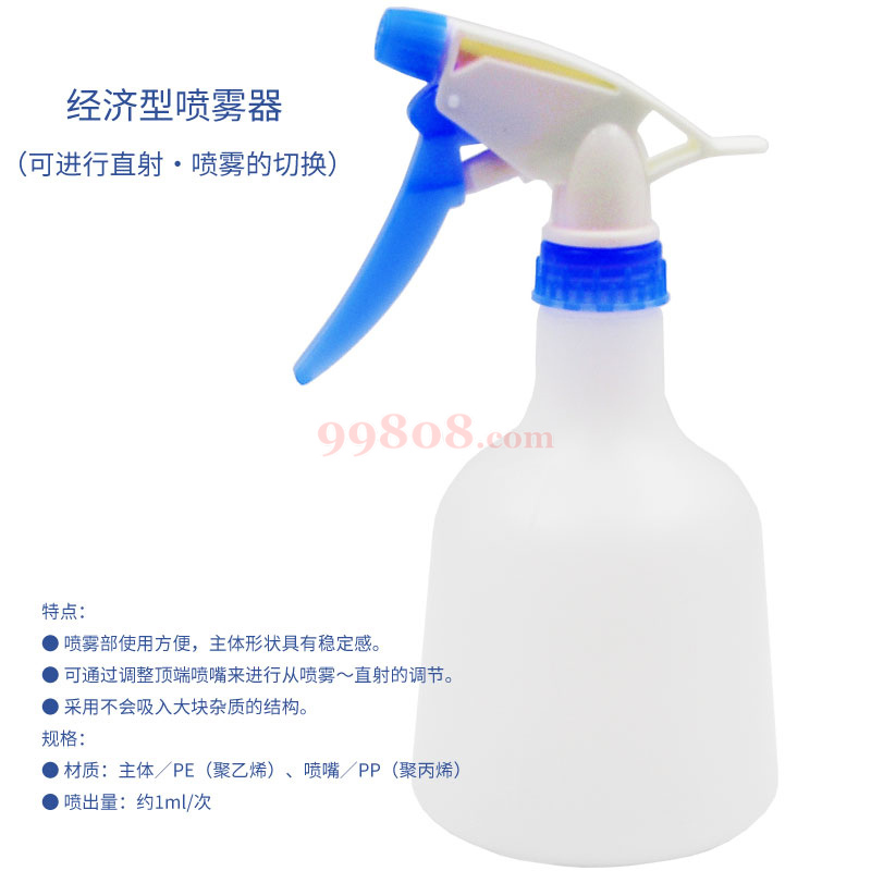 ● 喷雾部使用方便,主体形状具有稳定感。 ● 可通过调整顶端喷嘴来进行从喷雾~直射的调节。 ● 采用不会吸入大块杂质的结构。 ● 材质:主体/PE(聚乙烯)、喷嘴/PP(聚丙烯) ● 喷出量:约1ml/次