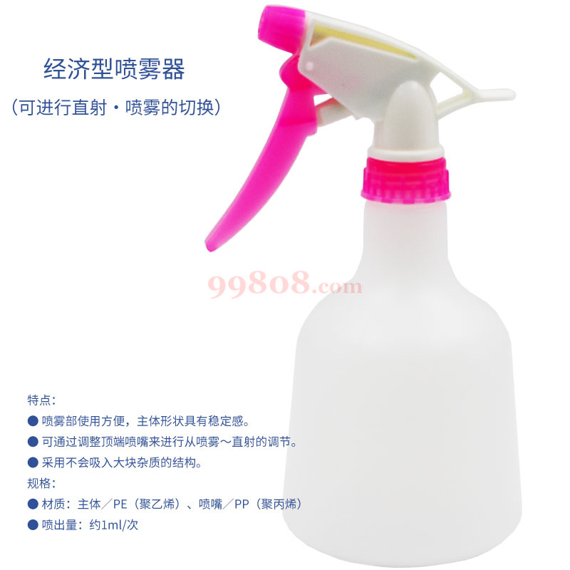 ● 喷雾部使用方便,主体形状具有稳定感。 ● 可通过调整顶端喷嘴来进行从喷雾~直射的调节。 ● 采用不会吸入大块杂质的结构。 ● 材质:主体/PE(聚乙烯)、喷嘴/PP(聚丙烯) ● 喷出量:约1ml/次