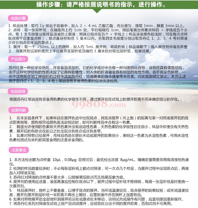 本方法适用于苏丹红(1、2、3、4号)等油溶性非食用色素的现场快速检测。