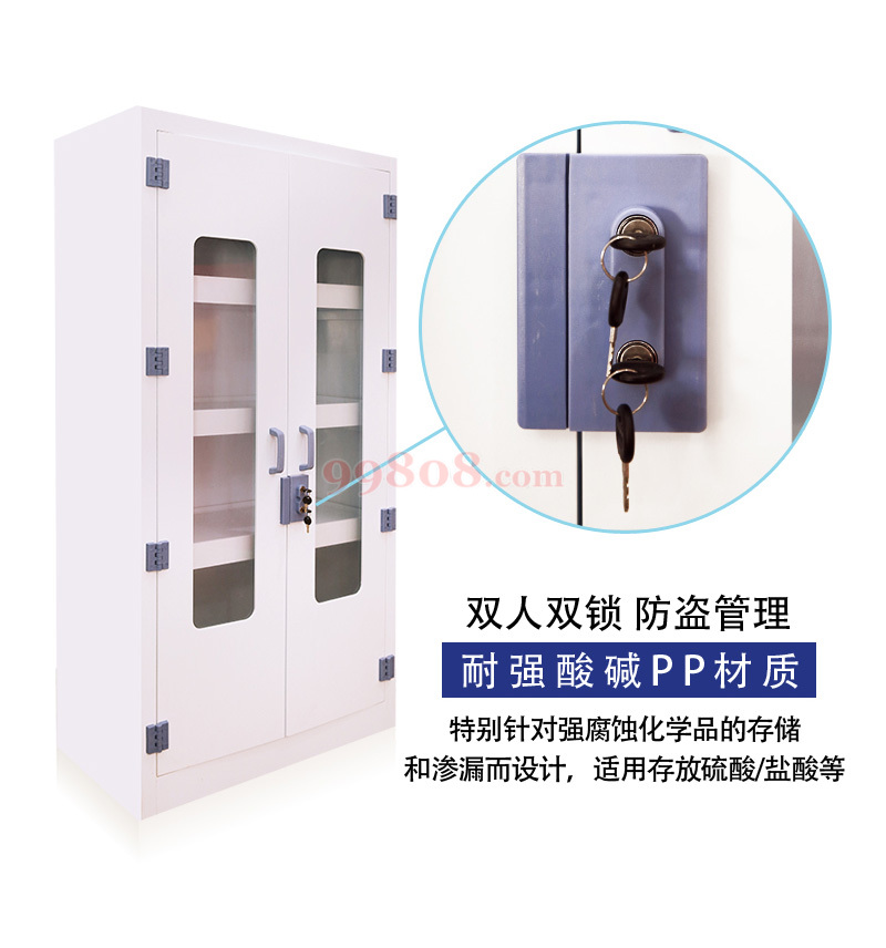 实验室内需用到不同类型的化学药品,因此需要根据化学品的特性来选择相符合的储存柜,PP酸碱柜是特别针对强酸、强腐蚀的化学品的储存和防渗漏要求而设计的产品,可适用于各类实验室:药物实验室、 食品实验室、 半导体实验室、痕量金属实验室、生物实验室电子实验室等化学实验室。