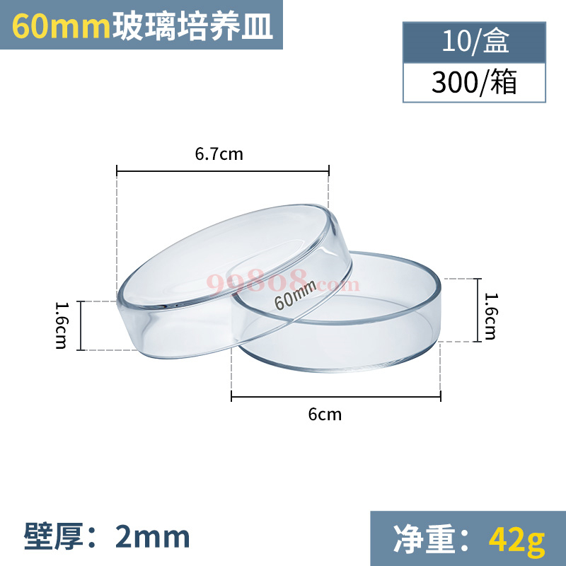 【别名】双碟、平板皿、双重皿、培养碟 【英文名】Petri culture dishes 【材质】高品质硼硅玻璃制品,有耐药性,溶出量少,可放心使用。 【规格】培养皿规格尺寸的计算,在国际上有两种不同的计算方法:一种方法是按皿盖计算,理由是在培养时使用恒温箱内进行培养,它可以计算恒温箱的体积可存放多少个培养皿;另一种计算方法是按照培养皿皿底计算,理由是在培养时可按照培养皿的皿底体积计算使用多少培养基。