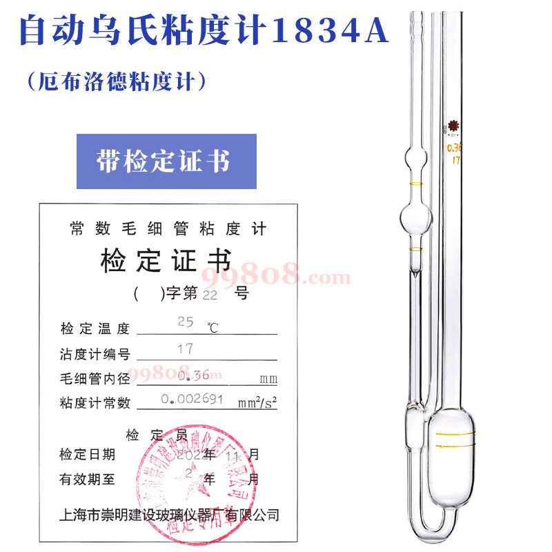 1834A乌氏粘度计 (厄布洛德粘度计) 附常数 用于自动粘度仪[LAUDA]及国内自动粘度仪配套,可用来测定石油运动粘度及聚合物稀溶液粘度和特定粘度。是测定液体粘滞性及高聚物分子量的重要仪器,其测量范围可达数万厘(mm2/S)。优点是使用方便,而且较其它类型粘度计精确。所以广泛应用子石油工业,化学工业,及其它工业部门和科学研究中。产品全长290mm。 本系列粘度计按ISO3105-76玻璃毛细管粘度计标准制造, 适用于石油等产品粘度测定法标准中使用的仪器。