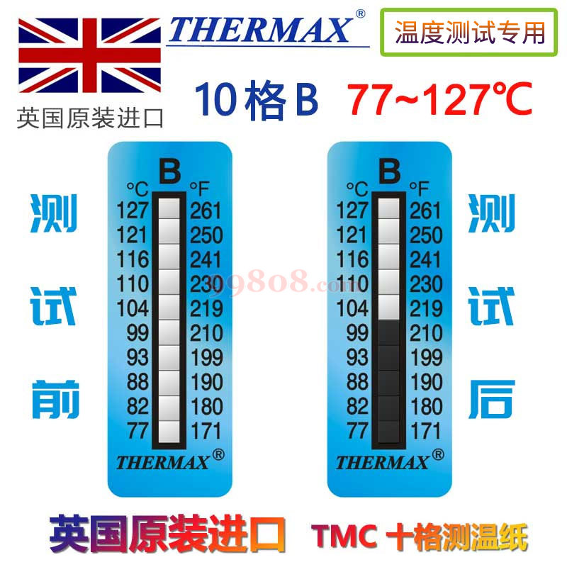 英国Thermax(TMC) 10格测温纸采用温度测量的新概念,在小型贴纸上布有一列方格,代表不同的温度值,当温度上升至该温度点时,方格会转变成黑色,即使随后温度降低,亦不会再回复到原来的颜色,如此便可以知道物体曾经历过的Γ 高温度,不需长时间在旁监视就可以知道是否有超温现象,或利用该试纸作为品质合格的有力证据。