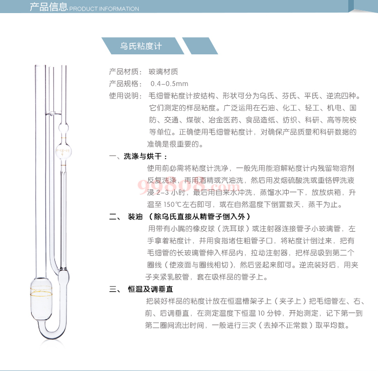 使用前必需将粘度计洗净,一般先用能溶解粘度计内残留物的溶剂反复洗涤,再用酒精或汽油洗,然后用发烟硫酸洗或重铬钾洗液浸2-3小时,Γ后用自来水冲洗,蒸馏水冲一下,放放烘箱,升温至150℃左右即可,或在自然温度下倒置数天,蒸干为止。