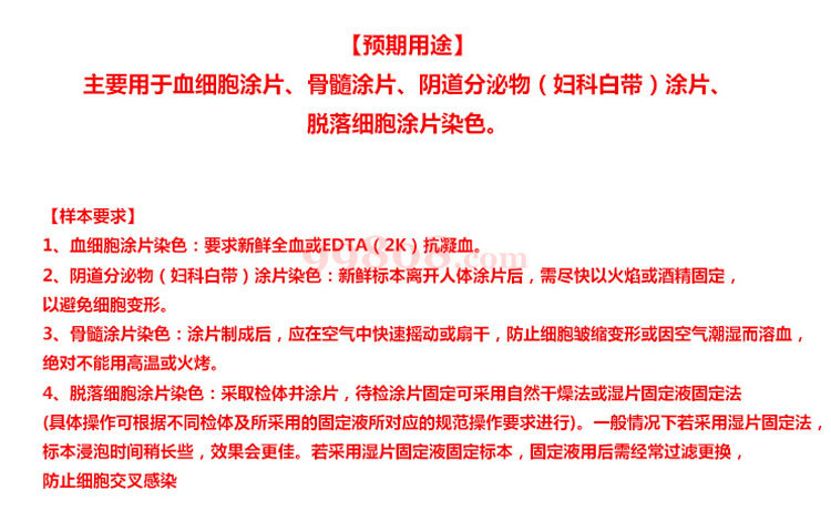 主要用于血细胞涂片、骨髓涂片、阴道分泌物(妇科白带)涂片、脱落细胞涂片染色。