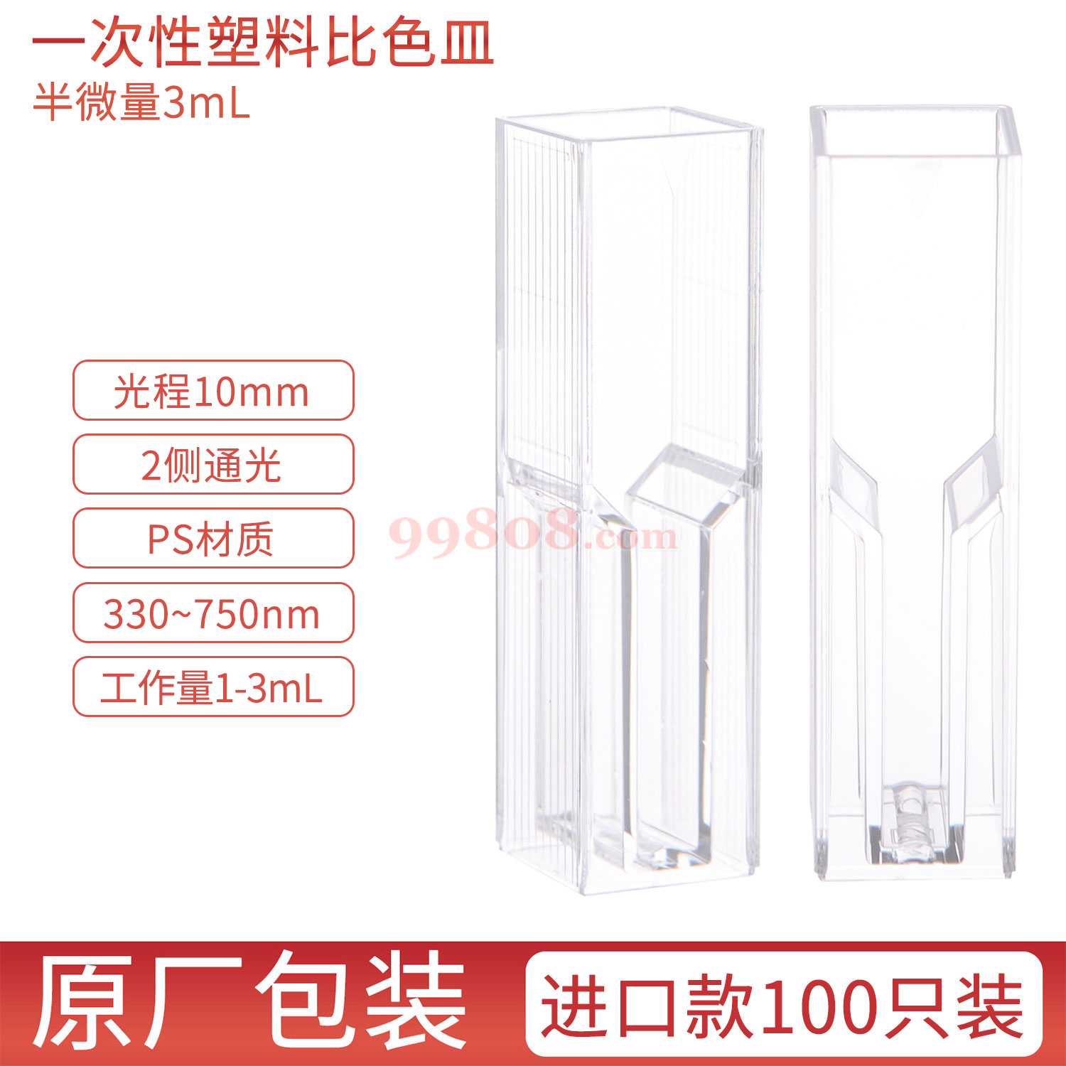规格:半微量 3mL PS 光程10mm 2侧通光