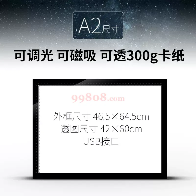 ● 匀光层面板,光线更柔和,没有黑点刺眼感; ● 双灯带高亮度设计,透300g水彩纸无压力; ● A4 38颗灯珠、A3 54颗灯珠、A2 108颗灯珠,高功率透光更清晰; ● 暖色调6500-7000k透光色温,两个小时也不会产生不适感。