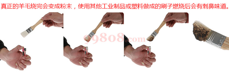 羊毛是人类在纺织上常用的纤维之一,也是工业毛刷常选用的材料之一。真正的羊毛烧完会变成粉末,使用其他工业制品或塑料做成的刷子燃烧后会有刺鼻味道。