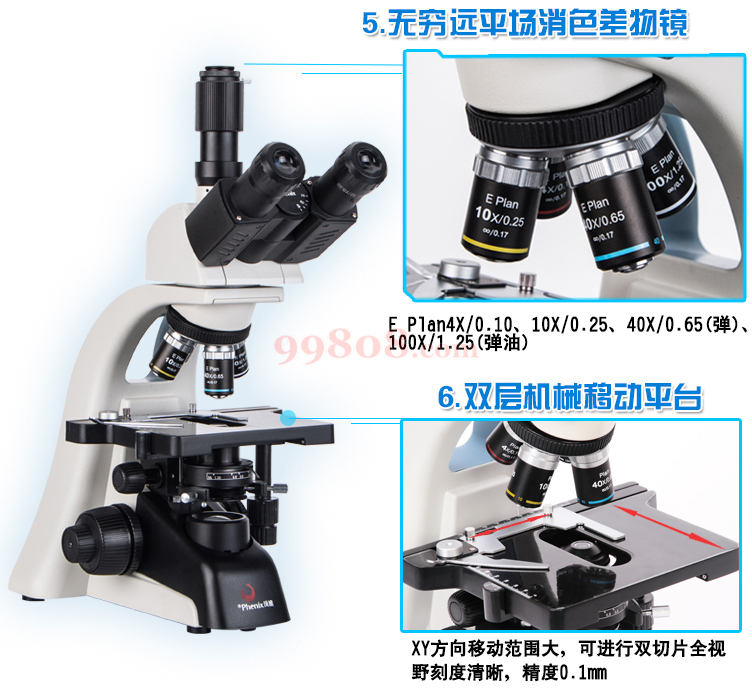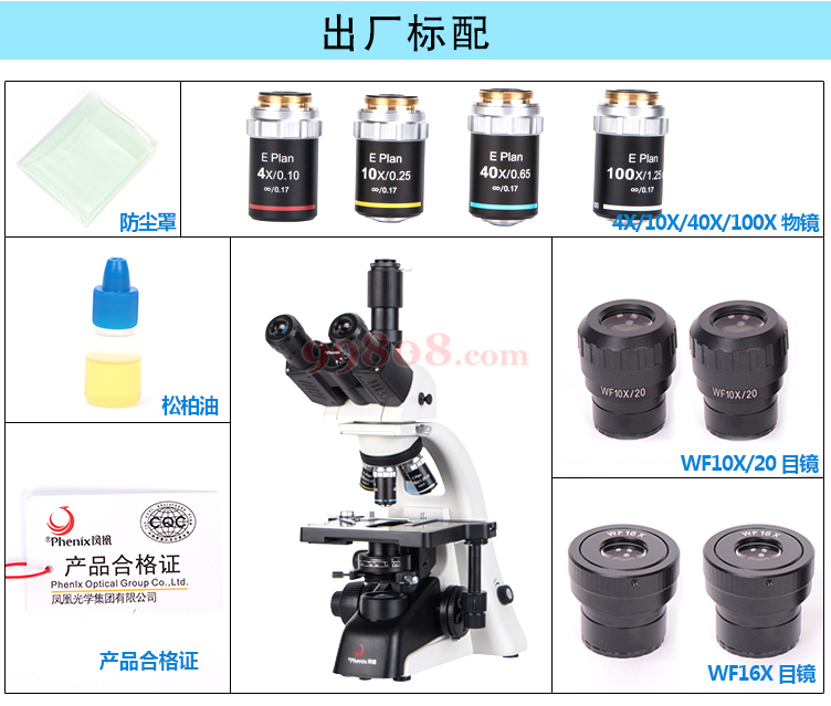 【物 镜】:无穷远平场消色差物镜4X、10X、40X(S)、100X(O,S)