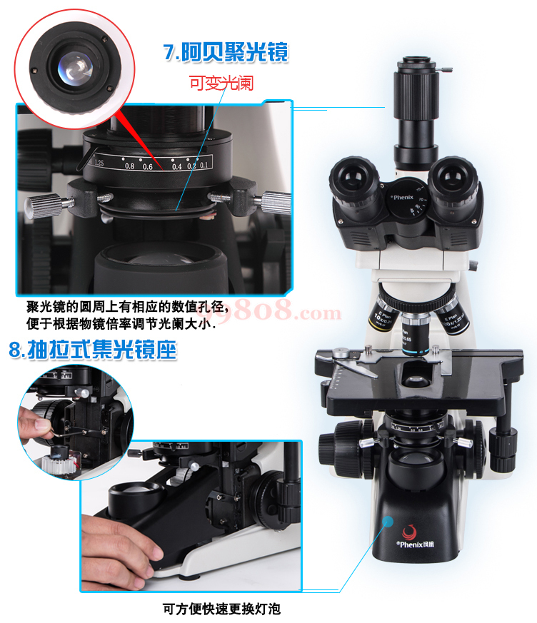【聚 光 镜】:阿贝聚光镜,N.A.=1.25,中心可调,带可变光栏及滤光片托架