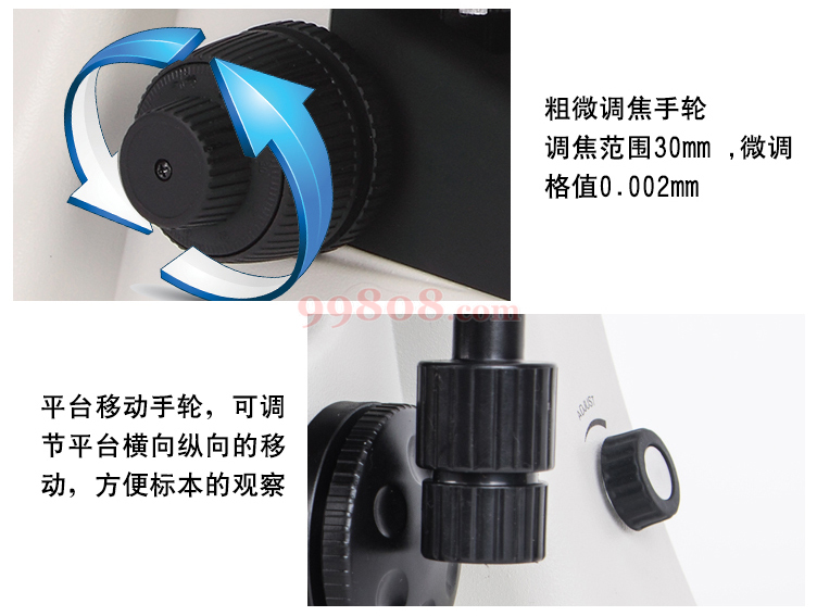 【调焦机构】:粗微动同轴,带有手轮松紧调节和限位装置,粗调22mm,微调精度0.002mm