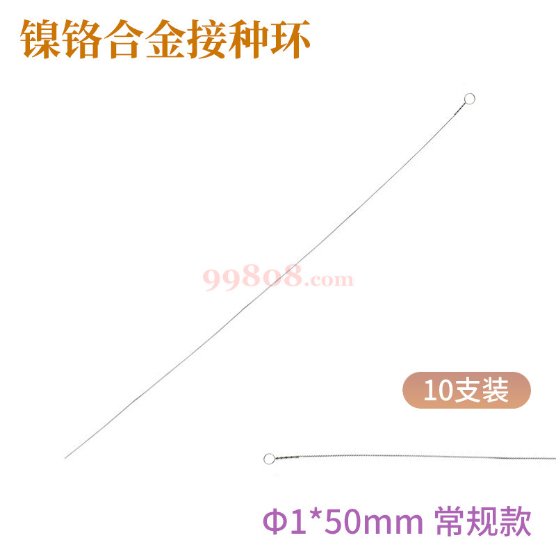 镍铬合金接种环是在德国铂金的基础上,采用替代材料开发的,其特点有: 其一,耐高温的性能不比铂金的低,在高温情况下,镍铬合金接种环的使用弹性(刚性)相反的比铂金接种环强,寿命反而高。使用期长。 其二,与普通的金属接种环比特性不言自明。 其三,与塑料接种环的方便相比,同样,可以成批在高压灭菌锅高温消毒后使用,达到不用每次消毒的目的。