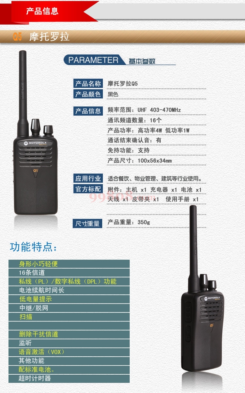 频率范围:403--470MHz 信道数量:16(出厂默认只有5个信道,如需添加请联系客服,否则默认都是按出厂发货) 外形尺寸(高×宽×厚):100毫米×56毫米×34毫米 重量:240克 射频输出功率:(高)4W、(低)1W