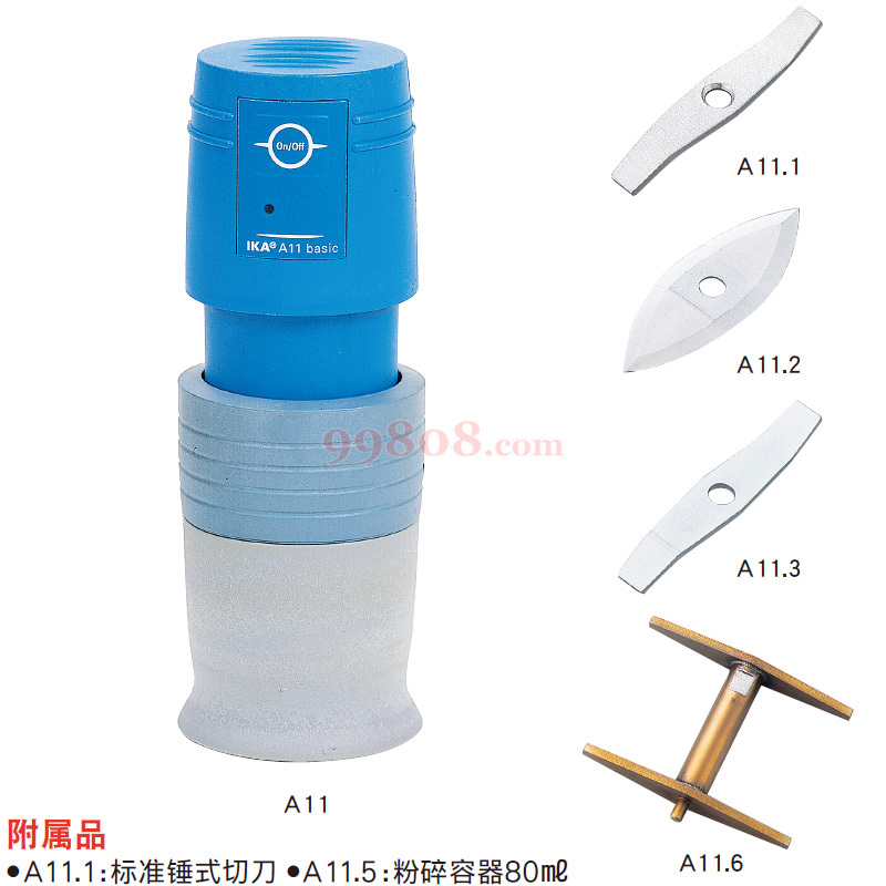 选配件: A11.4研磨杯, A11.1粉碎刀头, A11.2剪切刀头, A11.3粉碎刀头, A11.5研磨杯, A11.7保护罩, A11.6双头粉碎刀头