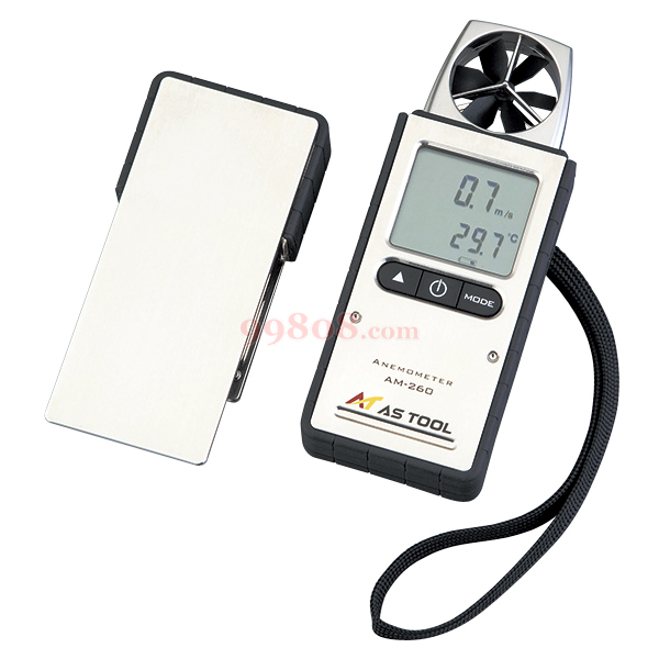便于携带的轻便紧凑尺寸!●小型?轻量型风速计。 ●带固定显示值的数据保持功能。 ●带MAX/MIN/AVG显示功能。●测试范围:0.4~20m/s、-10~+50℃、0~100%RH(AM-261) ●分辨率:0.1m/s、0.1℃、0.1%RH(AM-261) ●测试精度:风速/±2%rdg+0.2m/s、温度/±0.5℃、 ●电源:7号干电池×2节(另售) ●重量:约138g ●附属品:挂带、保护罩