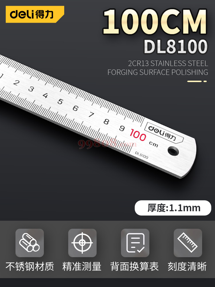● 厚度:0.1cm;规格:30cm,50cm 材质:不锈钢 ● 文字采用两色印刷,双色标记 ● 量程式刻的,清晰、精确、耐磨 ● 背面刻有众多公式或换算表,便于查找核对 ● 表面亚光处理,美观耐用,表面不易反光