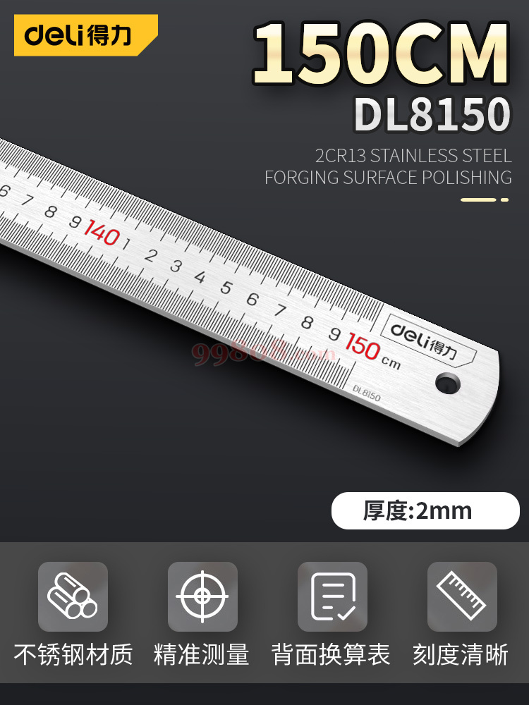 ● 厚度:0.1cm;规格:30cm,50cm 材质:不锈钢 ● 文字采用两色印刷,双色标记 ● 量程式刻的,清晰、精确、耐磨 ● 背面刻有众多公式或换算表,便于查找核对 ● 表面亚光处理,美观耐用,表面不易反光