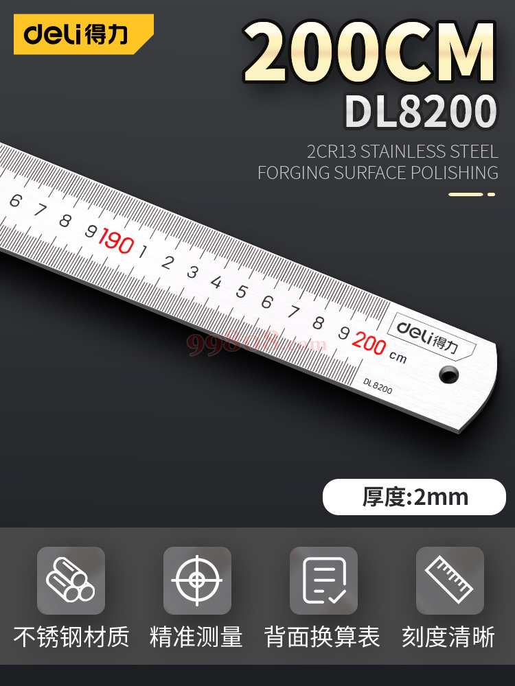 ● 厚度:0.1cm;规格:30cm,50cm 材质:不锈钢 ● 文字采用两色印刷,双色标记 ● 量程式刻的,清晰、精确、耐磨 ● 背面刻有众多公式或换算表,便于查找核对 ● 表面亚光处理,美观耐用,表面不易反光