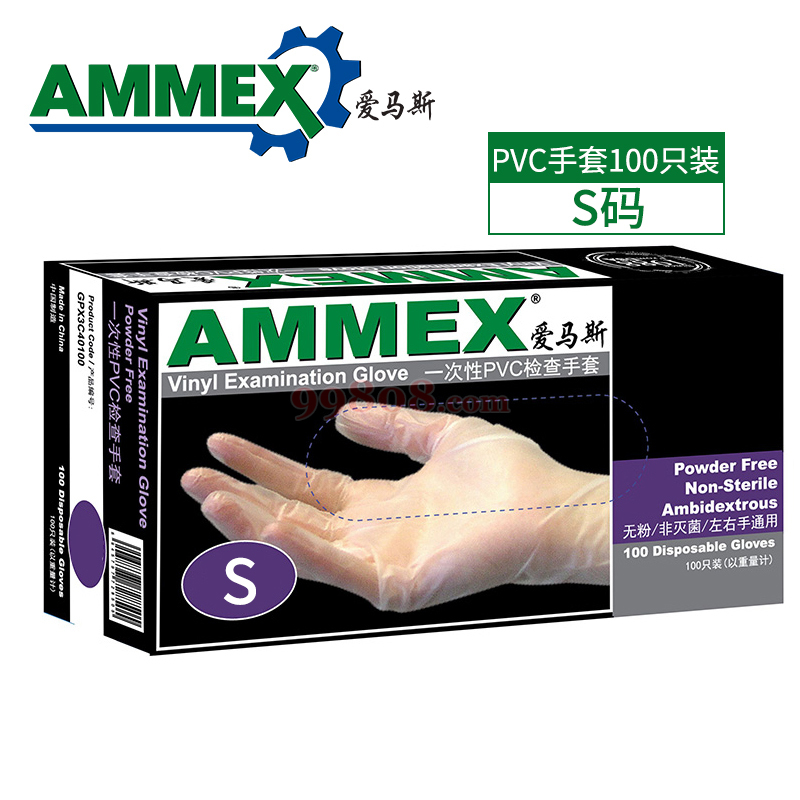 AMMEX/爱马斯 | 一次性无粉透明PVC手套 | S 无粉光面 1盒