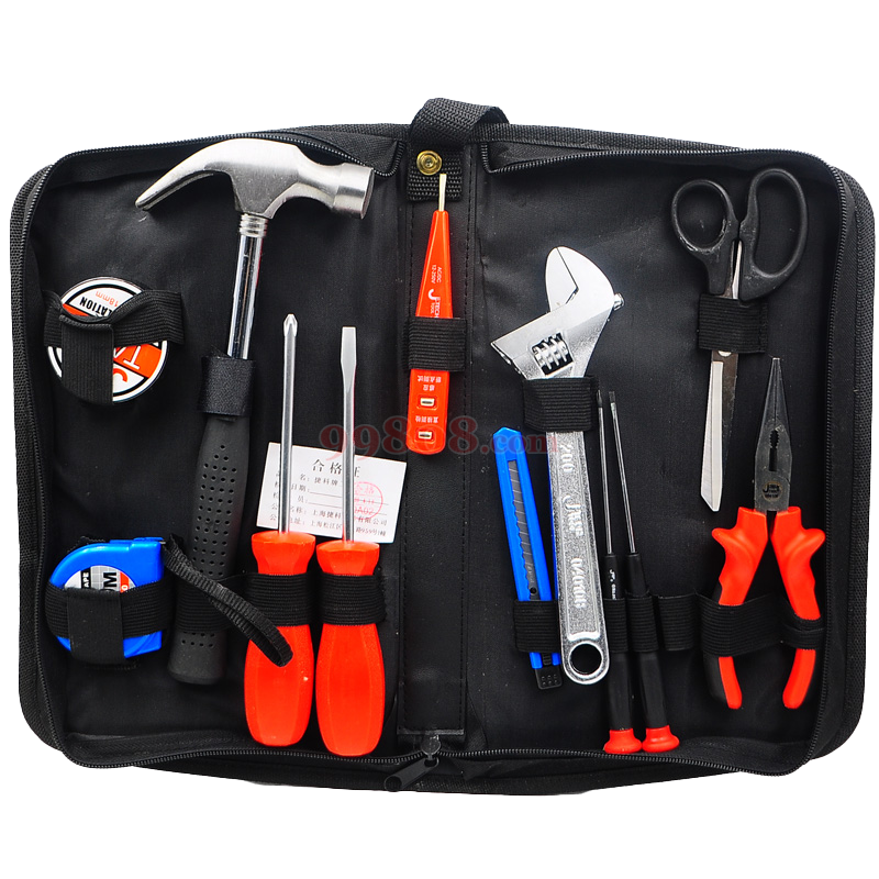 包含:直通螺丝批十字一字:6×100mm 橡胶弹力精密批:十字一字:2.5×75mm;不锈钢剪刀 钢柄羊角锤 8"活扳手 3M卷尺 C型美工刀 数显没电笔 PVC胶带 6"德式柄多用尖嘴钳