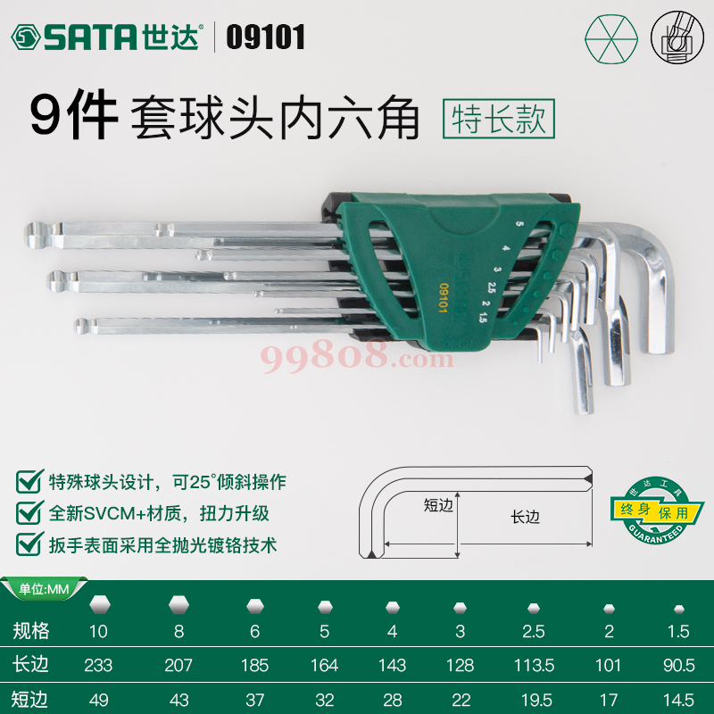 ·全新SVCM+材质,比Cr-V材质提高30%扭力。 ·外观设计,内六角插取更方便,不易脱落。 ·蝶形插套,外型更新颖。 ·扳手采用全抛光表面镀铬技术。