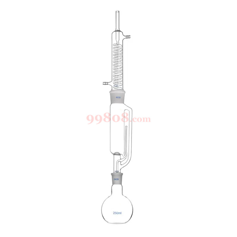 本器用于有机物质所含的脂肪、油脂的浸出试验。每套具冷凝管1支抽出筒1个及烧瓶1只。 索氏提取器,又称脂肪抽取器或脂肪抽出器。索氏提取器是由提取瓶、提取管、冷凝器三部分组成的,提取管两侧分别有虹吸管和连接管,各部分连接处要严密不能漏气。提取时,将待测样品包在脱脂滤纸包内,放入提取管内。提取瓶内加入石油醚,加热提取瓶,石油醚气化,由连接管上升进入冷凝器,凝成液体滴入提取管内,浸提样品中的脂类物质。待提取管内石油醚液面达到一定高度,溶有粗脂肪的石油醚经虹吸管流入提取瓶。流入提取瓶内的石油醚继续被...