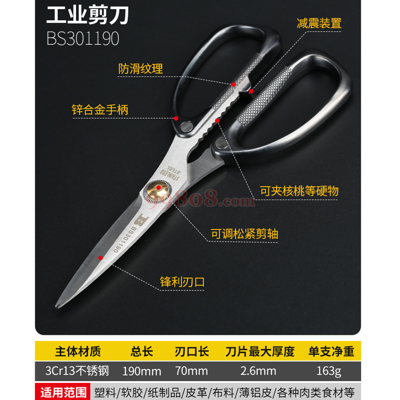 ·采用SUS420J2不锈钢材质(3.0mm厚度),刃口机磨,热处理,HRC±2,刀身镜抛,剪切锋利 ·高强度锌合金手柄,表面金属漆处理 ·用途:剪切皮革、塑料软胶、纸制品、面料、渔网等