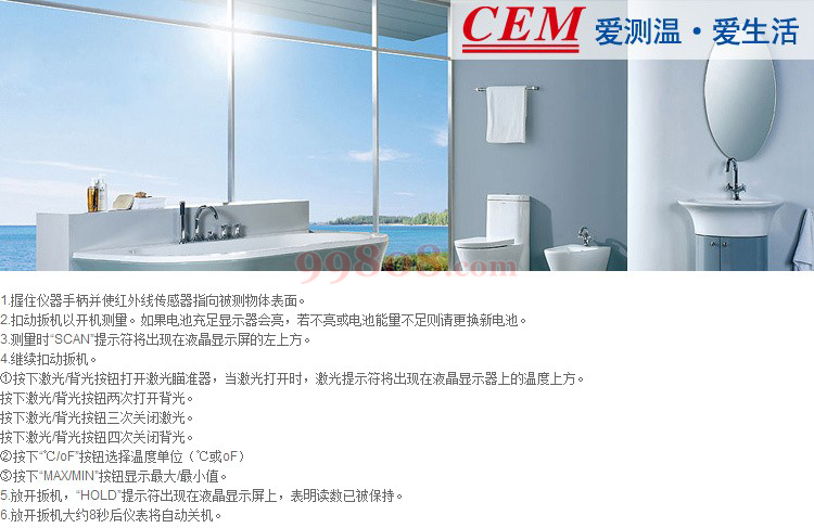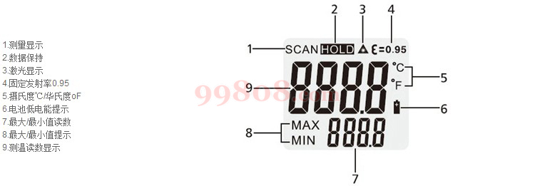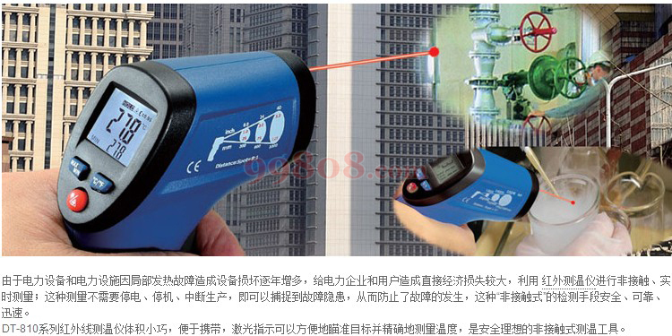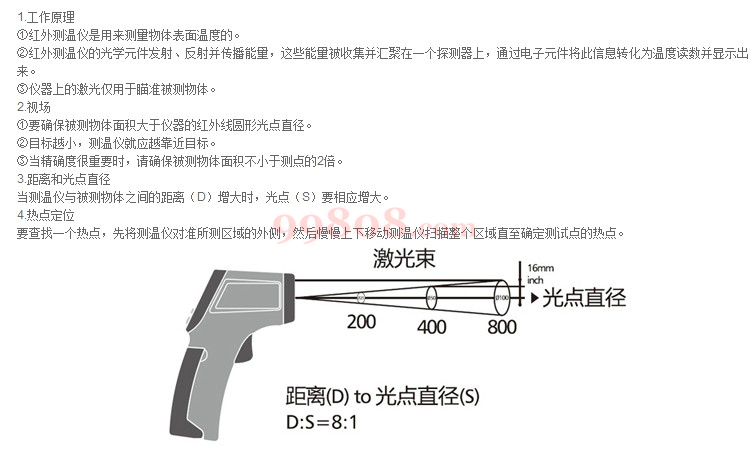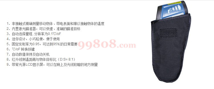 ● 非接触式精准测试移动物体/带电表面/难以接触物体等。 ● 内置激光瞄准器,可以快速、准确的瞄准目标。 ● 自动选择量程, 分辨率为0.1℃/℉。 ● 迷你设计,小巧轻便,便于使用。