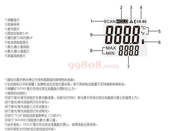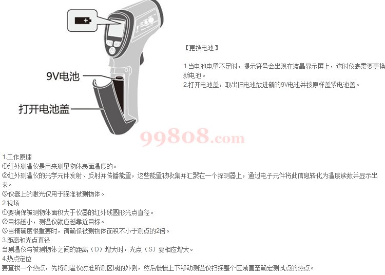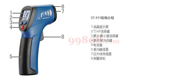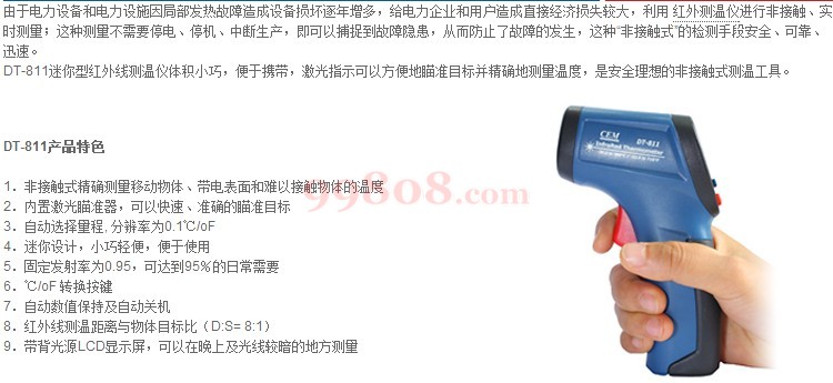 ● 非接触式精准测试移动物体/带电表面/难以接触物体等。 ● 内置激光瞄准器,可以快速、准确的瞄准目标。 ● 自动选择量程, 分辨率为0.1℃/℉。 ● 迷你设计,小巧轻便,便于使用。