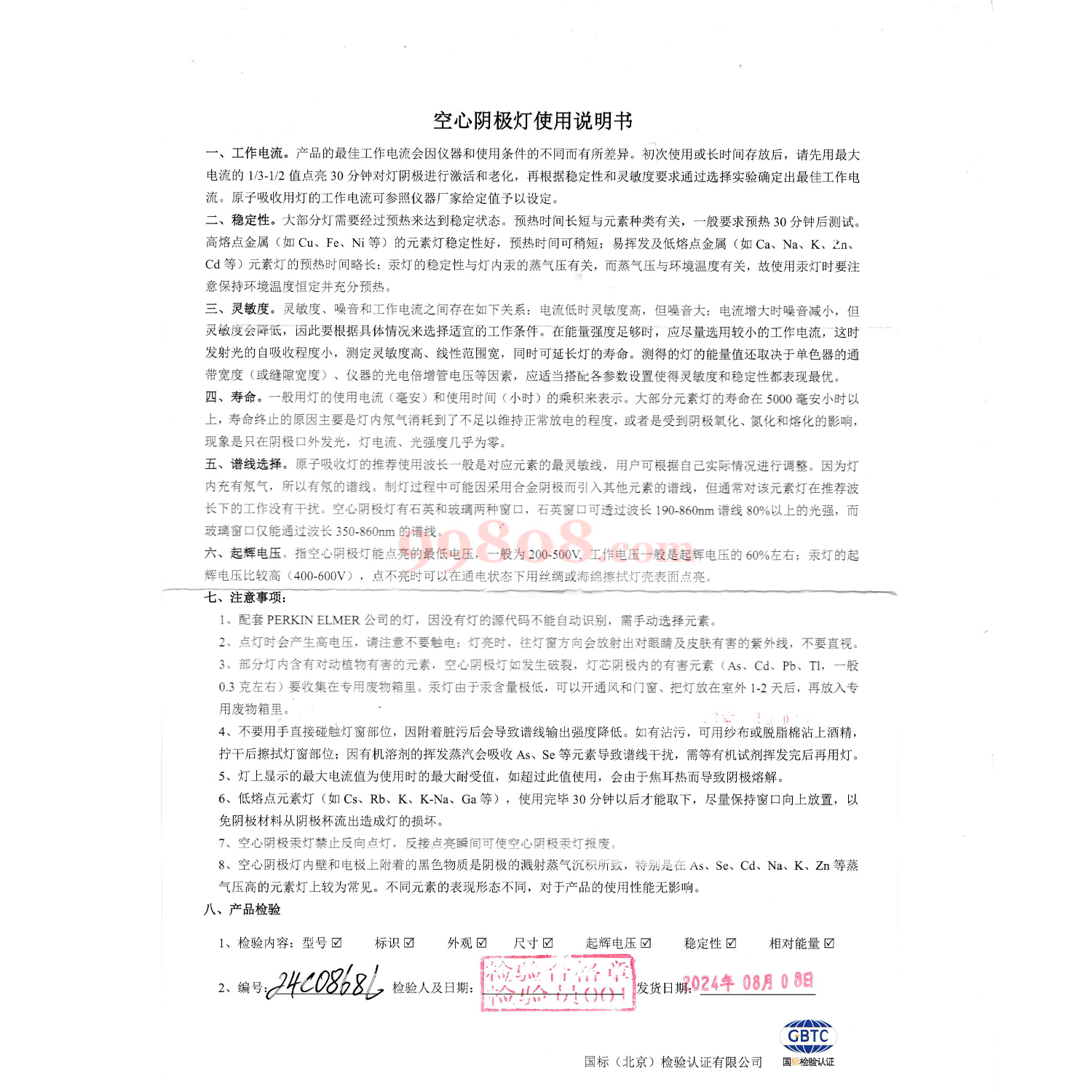 (4)使用低熔点元累(如As、Se等)的空心阴极灯时,应避免有较大的振动,用毕不能立即更换其他灯,需要冷却后再换。
