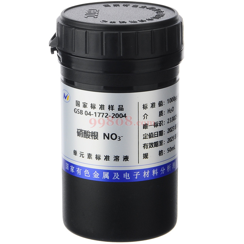 北京有色金属研究总院研制,100mL起浓度可定制。本液体标准广泛用于ICP-AES法、ICP-MS法、ICP-AFS法、原子吸收光谱法(AAS)、离子选择性电极光(ISE)、离子色谱法(IC)、分光光度法(COL)分析测试使用。可以在科学研究、实时检测、量值检验、质量控制、实验室认可、产品质量认证、数据对比、制定和评价检测方法、校准仪器、考核操作人员等相关工作中使用。