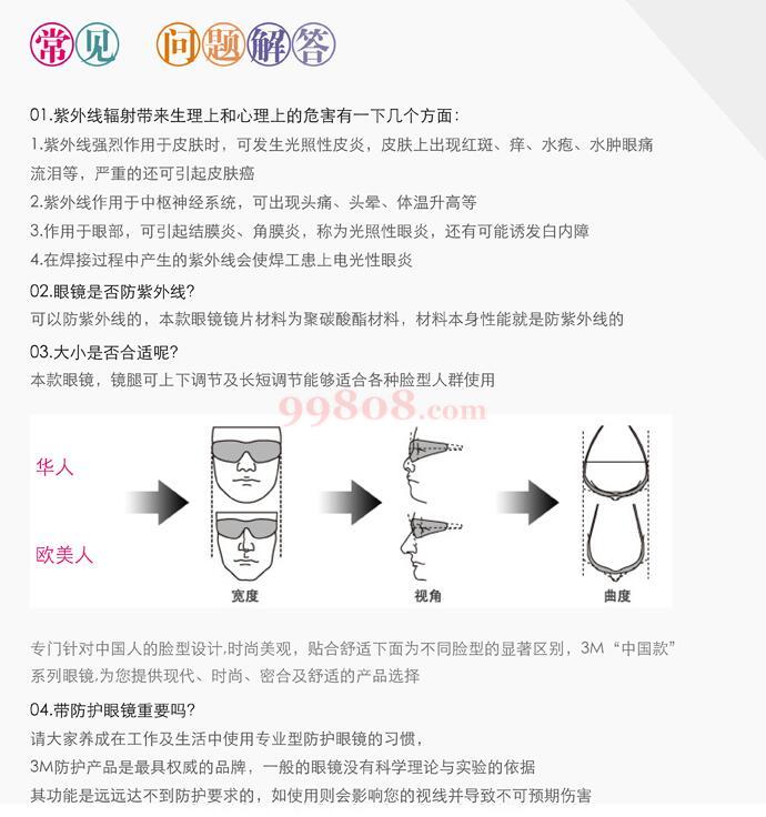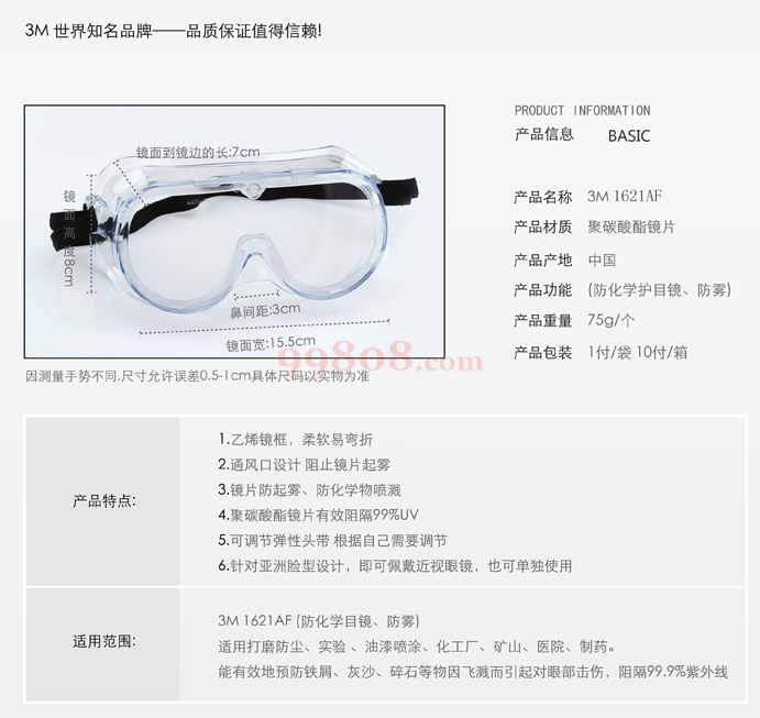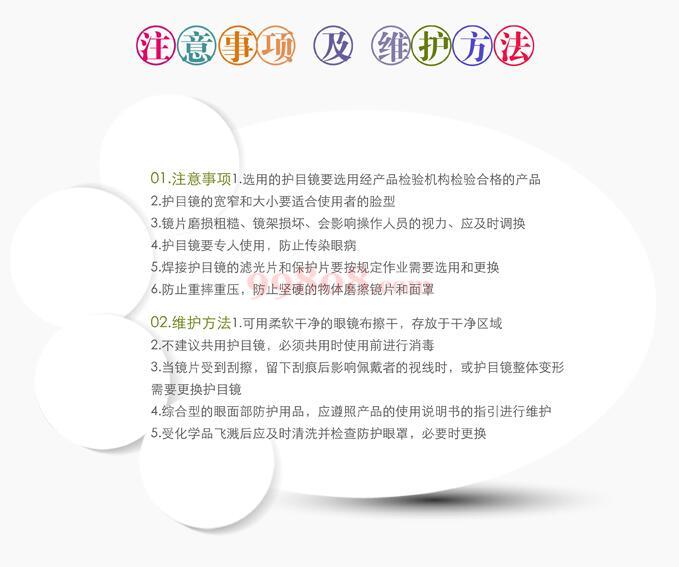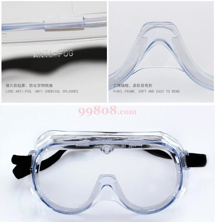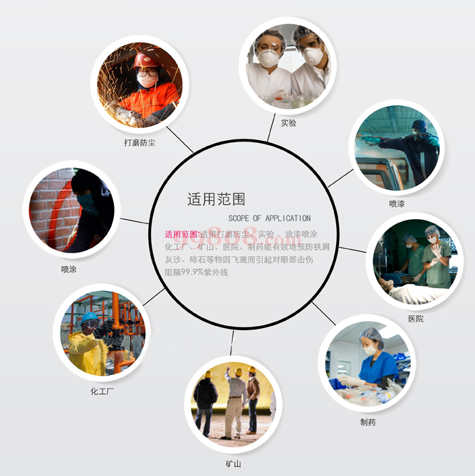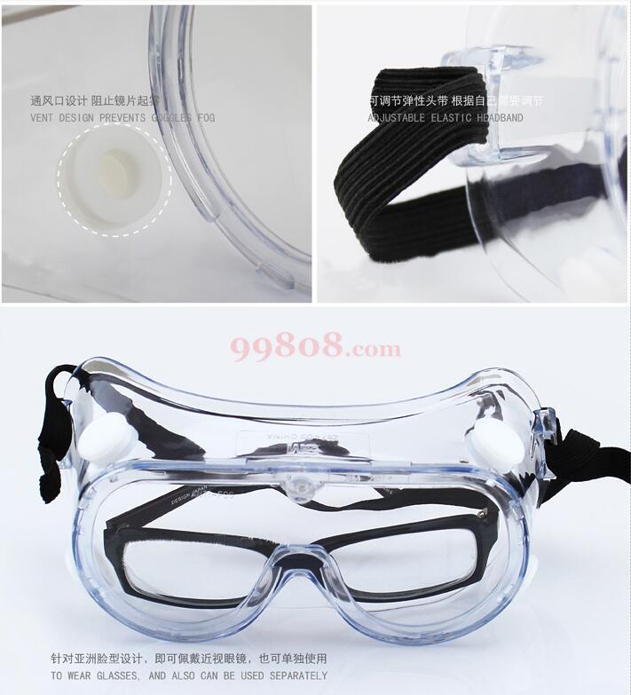 高透明度的聚碳酸酯或聚醋酸酯镜片,防冲击性能,抗刮痕,同时亦能有效抵御液体飞溅和雾气,抗化学腐蚀。镜框佩戴舒适,配有橡胶松紧带,可根据面部进行调节。