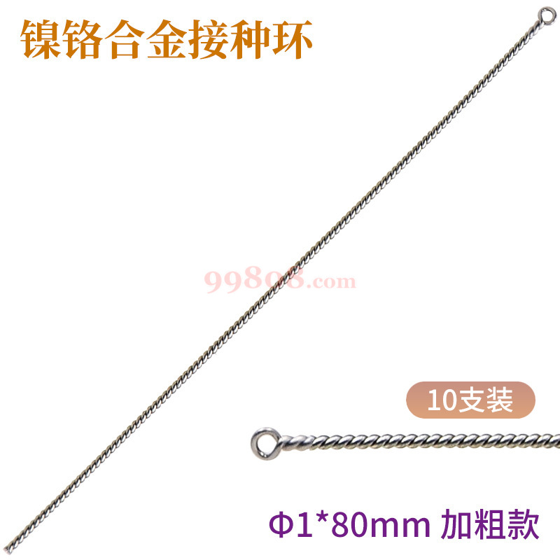 镍铬合金接种环是在德国铂金的基础上,采用替代材料开发的,其特点有: 其一,耐高温的性能不比铂金的低,在高温情况下,镍铬合金接种环的使用弹性(刚性)相反的比铂金接种环强,寿命反而高。使用期长。 其二,与普通的金属接种环比特性不言自明。 其三,与塑料接种环的方便相比,同样,可以成批在高压灭菌锅高温消毒后使用,达到不用每次消毒的目的。