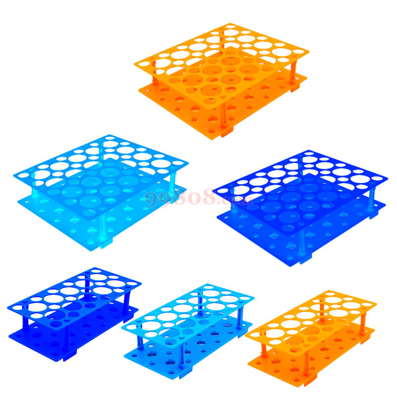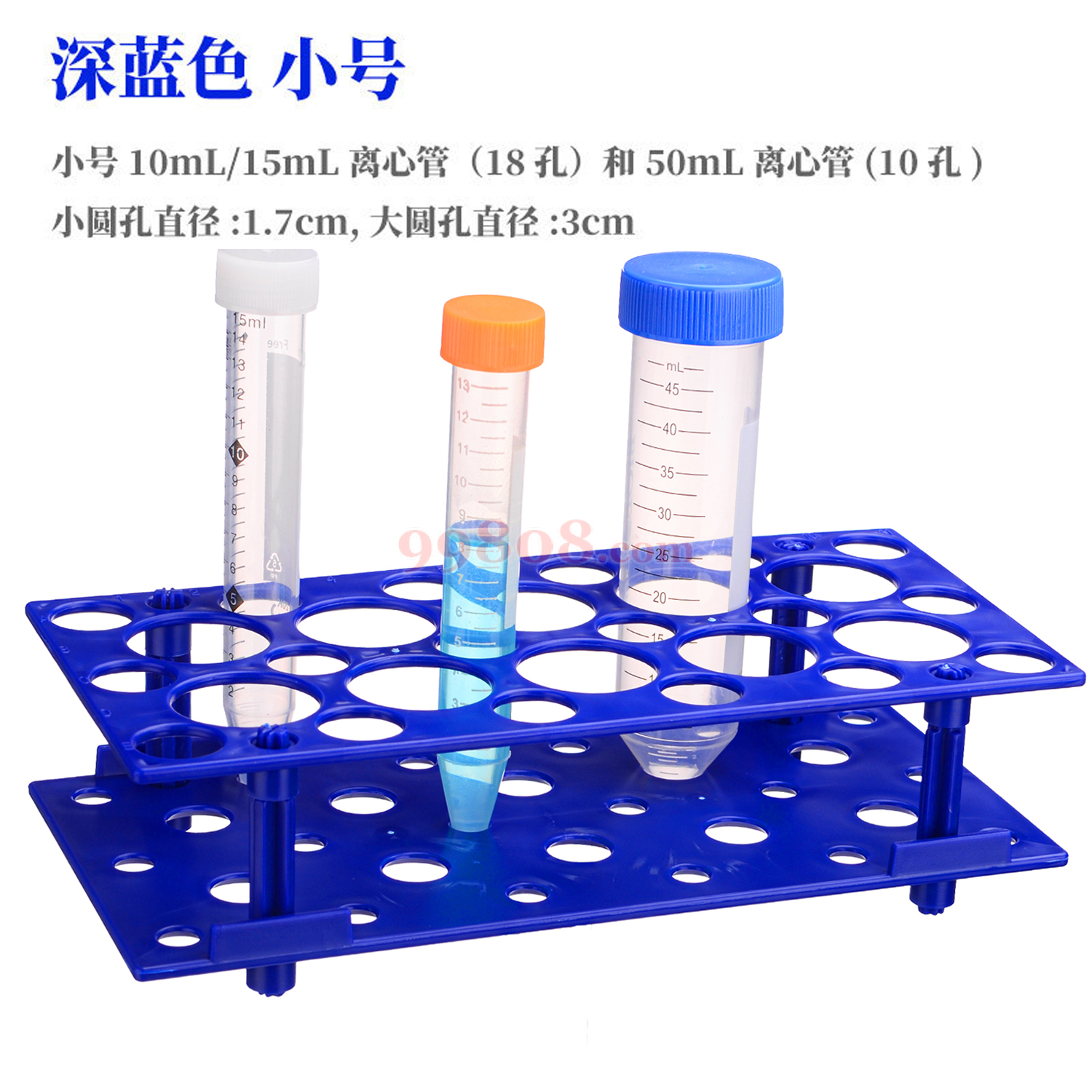 材质:ABS 装10\15\20\50mL离心管,高度不底于55mm的管子。 小号10mL/15mL离心管(18孔)和50mL离心管(10孔) 大号10mL/15mL离心管(30孔)和50mL离心管(20孔) 小圆孔直径:1.7cm,大圆孔直径:3cm