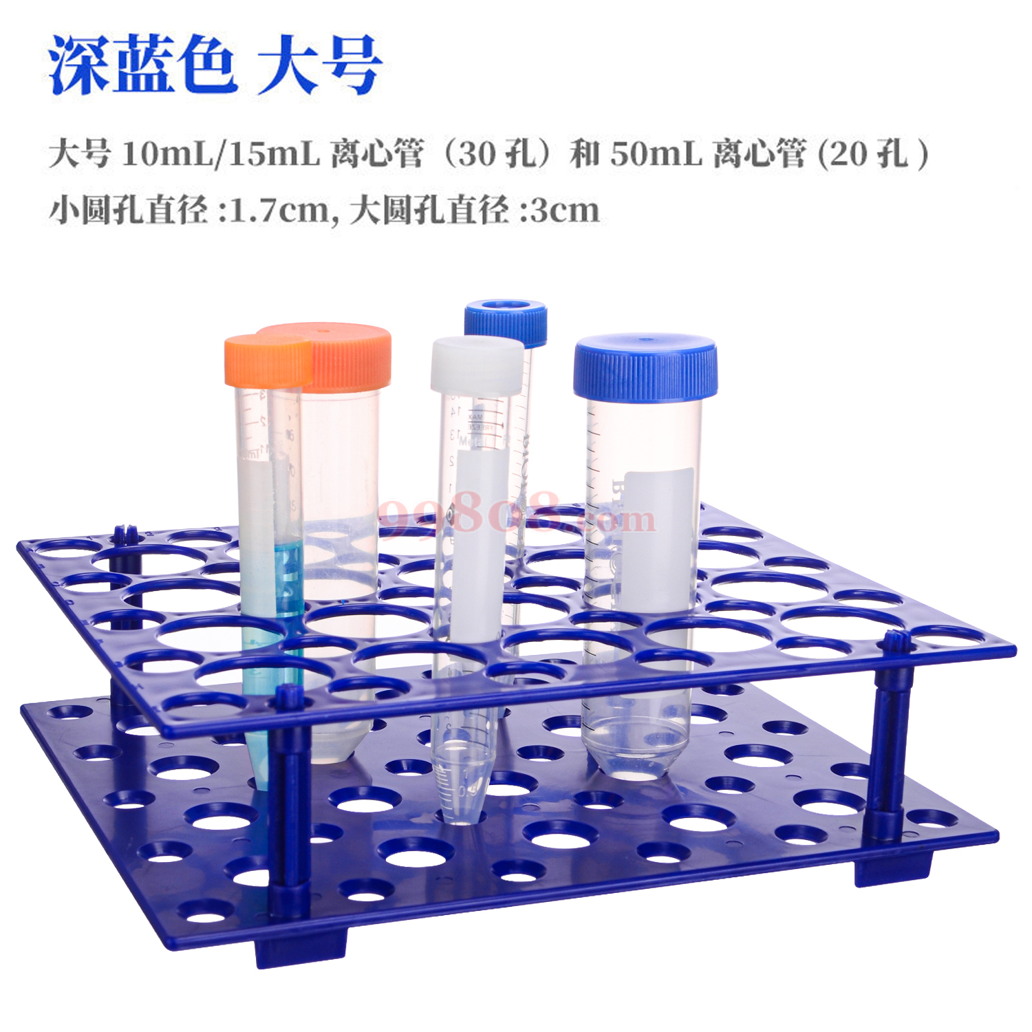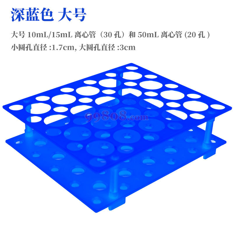 材质:ABS 装10\15\20\50mL离心管,高度不底于55mm的管子。 小号10mL/15mL离心管(18孔)和50mL离心管(10孔) 大号10mL/15mL离心管(30孔)和50mL离心管(20孔) 小圆孔直径:1.7cm,大圆孔直径:3cm
