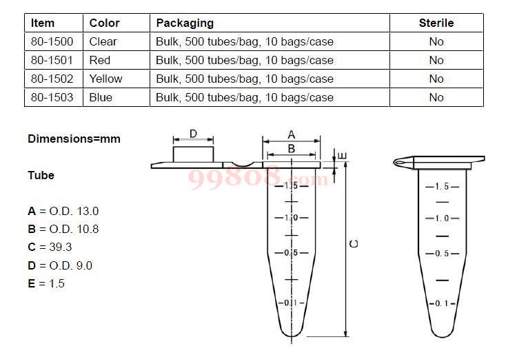 | 2629104 | 1.5ml (透明) 灭菌 | 500/袋 10/箱 | 80-1500-S | Biologix/巴罗克 | 起售:1 批量:1 | 箱 | ¥486.00/箱 | ||