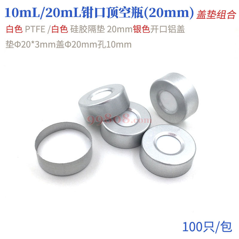 隔垫直径20mm,厚度3mm; 盖开口直径10mm;盖适用直径20mm钳口瓶口,使用时需用专用封口工具。