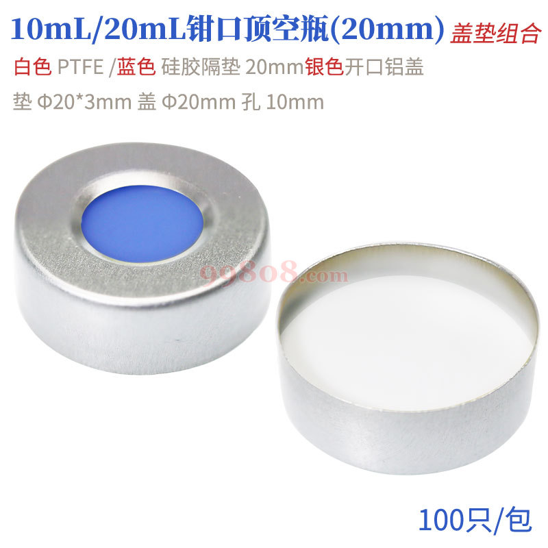 ReLAB | 10mL/20mL钳口顶空瓶(20mm) | 盖垫组合:白色特氟龙/蓝色硅胶隔垫 20mm银色开口铝盖